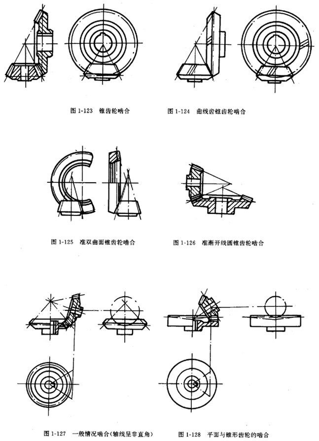 ③在圓柱齒輪嚙合、齒輪齒條嚙合和圓錐齒輪嚙合的剖視圖中,當剖切平面通過兩嚙合齒輪的軸線時,在嚙合區內,將一個齒輪的輪齒用粗實線繪制,另一個齒輪的輪齒被遮擋的部分用虛線繪制(圖1-119、1-1251、1-125、1-128);也可省略不畫(圖1-122、1-123、1-127)。