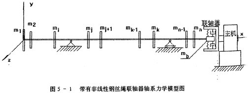 在第三章,根據試驗的基礎建立了具有非線性遲滯特性聯袖器的恢復力模型。這一章,將研究一個帶有這種聯軸器的軸系如圖5-1所示,該軸系有n個圓盤,由鋼絲繩聯軸器與主機相連接,按以下原則建立力學模型: