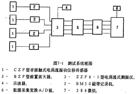 如圖6-l所示,實(shí)驗(yàn)臺安裝在一個4噸重的鋼質(zhì)平臺上,兩個球面球軸承支座1支承一根直徑為30毫米,長度為1500毫米的等直徑軸3,兩軸承座中間的袖上裝有一個直徑為300毫米,厚度為50毫米的圓盤2,軸的外伸端與調(diào)速電動機(jī)5之間有鋼絲繩聯(lián)軸器4相聯(lián)。在圓盤外緣以及在聯(lián)抽器從動端(內(nèi)套)與袖外伸端聯(lián)結(jié)處的水平和垂直方向各安裝一個非接觸式電渦流振動位移傳感器6。測試系統(tǒng)框圖如圖7-1所示。