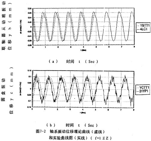 測量數(shù)據(jù)進(jìn)行分析處理后,結(jié)果如圖7-2~圖7-5所示。圖7-2(a)~(b)和圖7-3(a)~(b)分別給出調(diào)速頻率為1。2赫茲時圓盤和聯(lián)軸器從動端y方向的振動位移時域曲線,圖7-4、圖7-5分別給出聯(lián)軸器從動端、圓盤y方向的振動位移的理論和實(shí)驗(yàn)幅頻曲線圖(實(shí)線為理論曲線,圓點(diǎn)線為實(shí)驗(yàn)曲線),總的來看,理論與實(shí)驗(yàn)結(jié)果較好地重合。然而,在某些頻率點(diǎn)處,振運(yùn)位移幅值的理論計算與實(shí)驗(yàn)結(jié)果相差值,雖然絕對值差異并不大,但從相對值來講,差異較大,這是由于軸系還受到諸多因素,如軸承認(rèn)、軸承、電動機(jī)等振動的相互影響;當(dāng)然,測試儀器,數(shù)據(jù)處理都有可能產(chǎn)生誤差。由圖7-2、7-3還可以看到,理論計算與實(shí)驗(yàn)所得的振動位移時域曲線之間存在著相位差,這是因?yàn)椴杉瘮?shù)據(jù)時,時域曲線的相位不能保證與理論計算相位一致造成的,但這不影響兩者的本質(zhì)特性。