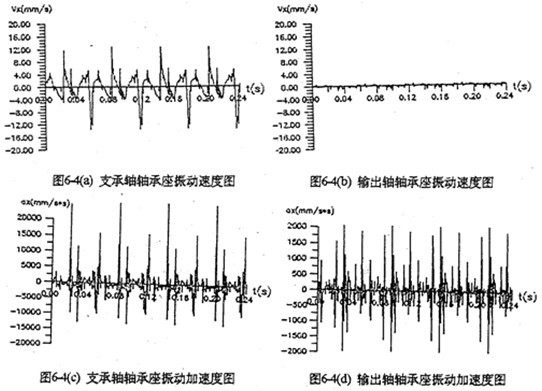 圖6-4是支承軸軸承座及輸出軸軸承座的振動速度及振動加速度時域圖。圖(c)中,一個周期內的三根較長的沖擊棒線分別是三相機構因死點引起的嚙合沖擊。軸承座的振動速度比齒板的振動速度小,但振動加速度比齒板振動加速芳略大,最大值為