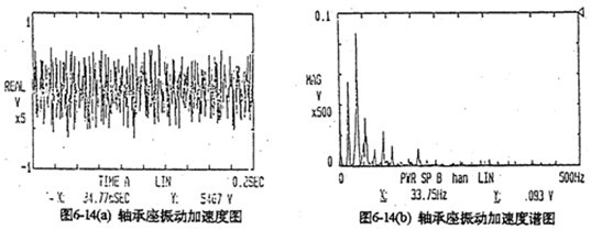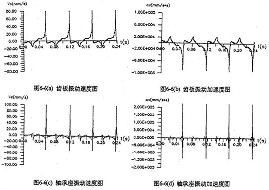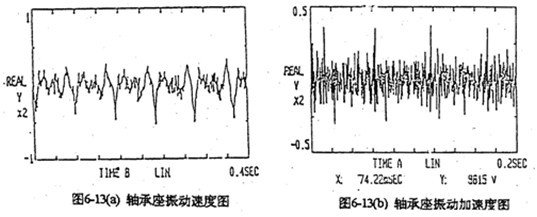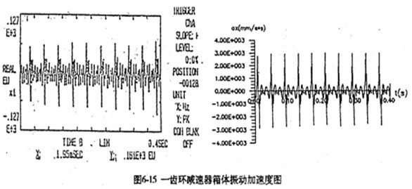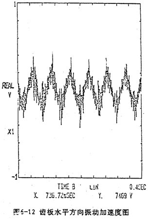 由于每片齒板都存在同樣的周期性激勵沖擊函數,相位差120°,迭加后的總效果仍然是轉頻周期函數。因此對箱體軸承座的沖擊也呈周期性。圖6-13是支承軸箱體軸承座的振動速度及加速度的實測時域曲線圖。其曲線圖的變化規律及幅值與圖6-4完全接近。速度及速度沖擊值為