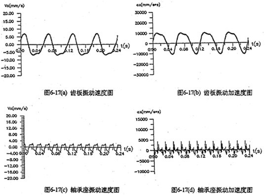 圖6-7是某相雙曲柄機構在輸入端具有0.03mm間隙時,齒板及軸承座的振動速度、振動加速度。圖中表明,速度、加速度都在兩個死點位置出現較大的沖擊值。