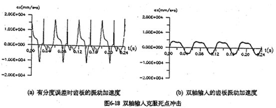采用雙軸輸人的齒板及箱體軸承座振動速度、加速度如圖6-17所示。從圖看出齒板速度及加速度值明顯變小(為單軸輸人時的0.3倍),而且無沖擊,完全屬于穩太振動。箱體的振動速度及加速度幅值只是單軸輸人時的0.2倍。圖6-18a是一軸的偏心套存在0.05度的分度誤差時齒板的加速度曲線圖,圖中明顯出現加速度沖擊棒線。采用雙軸輸入后,死點沖擊被徹底(見圖6-18b) , 變成穩態振動曲線了。因此,為了減小三環減速器的振動,有必要加大三環減速器的橫向尺寸,在箱體內增加一套雙軸輸入的齒輪功率分流機構,或者在箱體外另設計一套功率分流機構,以解決機構過死點的振動問題。
