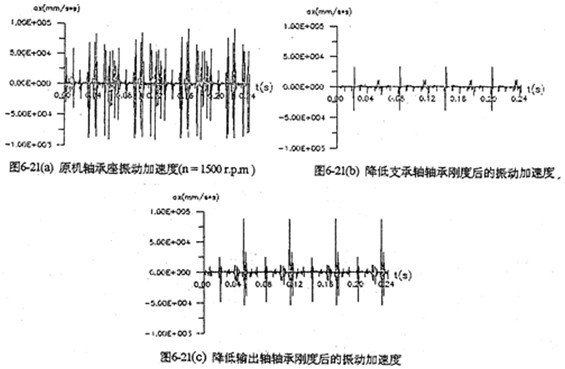 降低箱體軸承剛度是為了吸收內部機構對箱體的沖擊振動,減小沖擊幅值。圖6-21是轉速為1500(rpm)即時分別將支承軸及輸出軸的箱體軸承與軸之間加一3mm的彈性墊圈時,計算出的箱體振動加速度曲線。從圖中看出,減小支承軸箱體軸承剛度比減小輸出軸箱體軸承的效果更明顯。