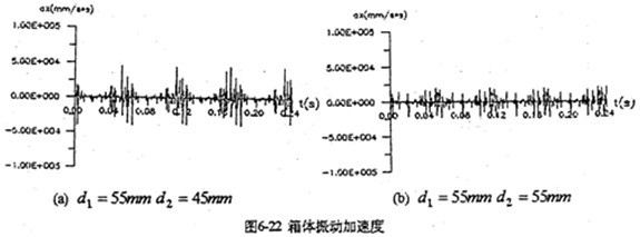 增加高速軸的剛度是降低沖擊載荷的重要途徑。軸的剛度大(值徑大),扭轉、彎曲變形小,雙曲柄機構變形也就小,這樣既減小了沖擊振動、又增加了軸的強度。圖6-22將高速軸的直徑由原來的45mm加到55mm后的,振動加速度圖。