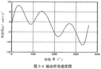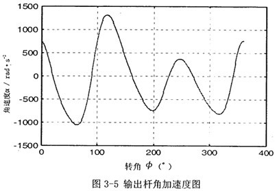 首先由圖3-2可以看到,若機(jī)構(gòu)結(jié)構(gòu)參數(shù)設(shè)計恰當(dāng),并且調(diào)整中間滑塊3偏移到合適的位置時,可在一定范圍內(nèi),產(chǎn)生一個反向的速度波適度抵消原速度波動。再由圖3-3可知,在未加入第二自由度時,加速度變化值不大,說明阻力矩和電機(jī)主動力矩不會受到大的影響,不致導(dǎo)致原機(jī)械系統(tǒng)的各項參數(shù)發(fā)生大的變化。