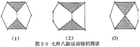 對于(5,5)來說,只有一種連接方式,作為一種混合動力驅動系統已有人做過研究,在本論文中,不能滿足設計要求,因此不可取;而(9,11)及以上又有40個(或更多)運動鏈之多,且構件多結構復雜,研究起來非常困難,暫不考慮;先考慮(7,8)七桿八副機構,其構建數量不是太多,結構不是太復雜,共有3個運動鏈(如圖2-5),特定化后又有11種(排除同構的機構)特定化導出機構,可以從中選擇可能適合的方案,因此以下將對(7,8)來詳細分析研究。