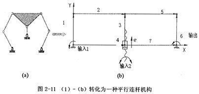 方案一:將(3)-(a)一般化鏈的所有連桿標號,再分配其中三副桿1作為機架,哪圖2-9(a)所示,這樣特定化后,再進一步轉化為(b)圖所示的裝置,連桿5改為滑塊,桿2作為第一輸入,第二輸入可以設定是滑塊5在桿4上的移動,可由伺服電機驅動,桿7作為輸出桿,可以滿足設計的初步要求。