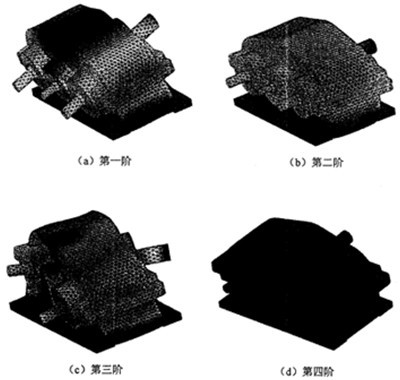 如圖3.22 所示的齒輪系統有限元模型,根據實際的安裝情況,為了能比較準確地反映實際狀態,箱體的邊界條件為:箱體底座垂直方向約束,四個螺栓孔處全部固定約束。則研究齒輪系統的約束模態,表3.14~3.15分別為用I-Deas軟件的Lanczos模態求解法計算得到的各重要零部件及齒輪系統前上10階固有頻率和響應的振型情況。限于篇幅,圖3.23給出了齒輪系統的前十階固有振型。