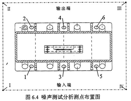 結(jié)構(gòu)振動噪聲測試在齒輪箱安裝基腳布置6個測點,測點布置圖見圖3中1-6測點,在每一測點上按31.5Hz~5kHz1/3倍頻中心頻率測試加速度級頻譜(re:a0=10-6m/s)和1/3倍頻中心頻率測試速度級頻譜(re:a0=5*10-8m/s)。空氣噪聲測試聲壓級基準2*10-5Pa,用聲級計上的A計權(quán)聲壓級和1/1倍頻程聲壓級測量減速齒輪裝置各個測點。各測點距齒箱測量表面的距離為1米。測點位置見測點布置圖6.4中Ⅰ-Ⅳ測點。