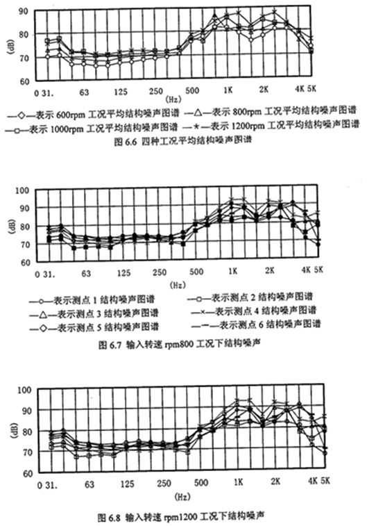 (5)從圖6.9空氣噪聲倍頻程圖譜可以看出,隨著轉(zhuǎn)速升高在小于1000Hz時空氣噪聲倍頻程幅值變化不大,但大于1000Hz至5000Hz時變化較明顯,這與減速器的嚙合頻率或嚙合頻率倍數(shù)成份上的振動幅值較大有很大關系。