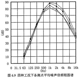 圖6.9為四種工況平均空氣噪聲倍頻程圖譜。由于減速齒輪裝置只是整個試驗系統(tǒng)的一部