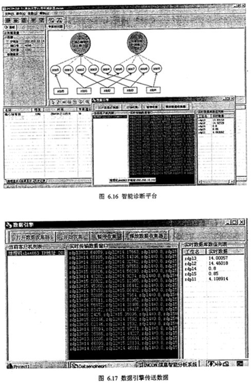 綜上分析,采用人機交互方式將Zdp14、Zdp15等參數(shù)輸入計算機,智能診斷系統(tǒng)得到雙環(huán)減速器故障診斷結(jié)果,偏心軸彎曲故障,程度值在0~1范圍變化,齒形誤差較大。智能診斷結(jié)果如圖6.15所示。圖6.16是智能診斷平臺進行現(xiàn)場一線診斷分析,圖6.17是數(shù)據(jù)引擎進行實時數(shù)據(jù)接收和數(shù)據(jù)發(fā)送。
