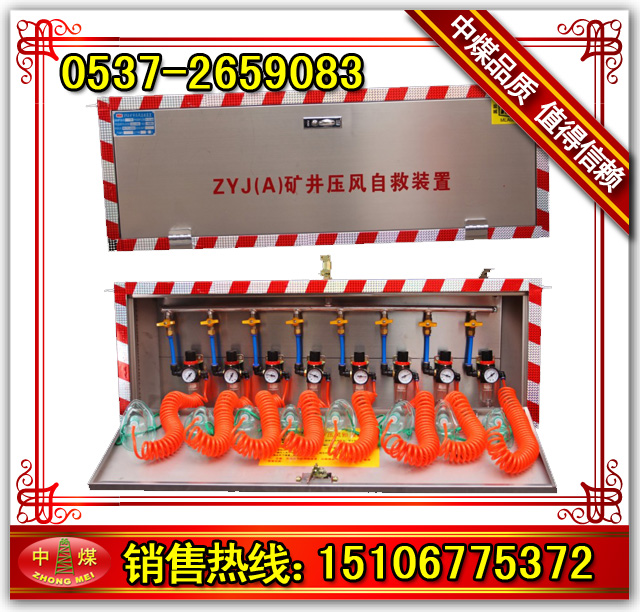 礦用壓風自救裝置包括箱體,箱體上設有壓風接頭,其內設有多組分別與壓風管相連的呼吸器,每組呼吸器的支管上均設有手動進氣閥。當作業場所發生有害氣體突然涌出、冒頂和坍塌等危險情況時,現場人員來不及撤離,可就近利用壓風自救裝置實行自救。打開門蓋,取出呼吸面罩帶上,鈕開進氣閥,通過供氣量調節裝置對壓風管路提供的壓風根據需要進行調節,再通過氣動減壓閥,進行減壓和消除噪聲,然后由積水杯將不清潔的壓風變成清潔的呼吸空氣,供給現場人員呼吸,達到穩定情緒、實現現場自救目的。該裝置結構緊湊,使用方便,具有廣泛的實用性。