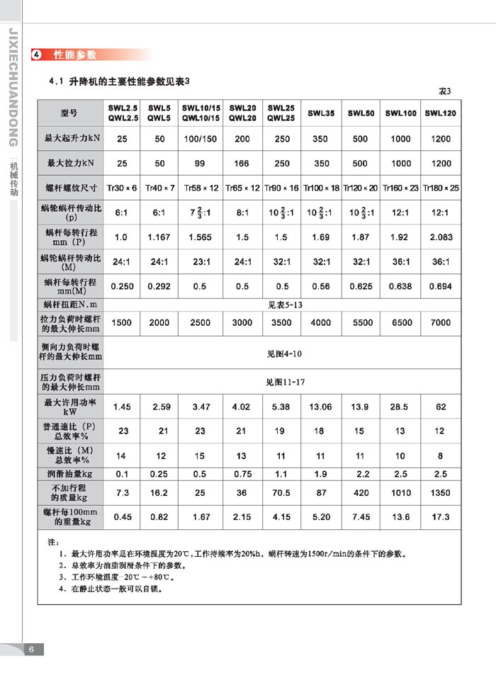 QWL系列蝸輪絲桿升降機(jī)是一種基礎(chǔ)起重部件,已列為JB/ZQ4391-86標(biāo)準(zhǔn)。承載能力2.5-120T。具有結(jié)構(gòu)緊湊,體積小,重量輕,動力源廣泛。無噪音,安裝方便,使用靈活,功能多。配套形式多,可靠性高,使用壽命長等許多優(yōu)點。具有提升、降落、推進(jìn)、翻轉(zhuǎn)等多種功能。可單臺也可組合使用,可能用電動機(jī)或其他動力直接帶動,也可手動。有不同的結(jié)構(gòu)型式和裝配方式,提升高度可按用戶的要求制造,該裝置可以自鎖。