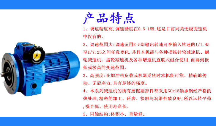 2、調速范圍大:調速范圍R=5即輸出轉速可在輸入轉速的1/1.45至1/7.25之間任意變化,并且本機能與各種擺線針輪減速機、蝸輪減速機、齒輪減速機及各種增速機直聯式組合使用,而得到極低或極高的變速范圍。