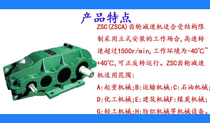 ZSC(ZSCA)齒輪減速機適合受結構限制采用立式安裝的工作場合,高速轉速超過1500r/min,工作環境為-40℃~+40℃,可正反轉運行。