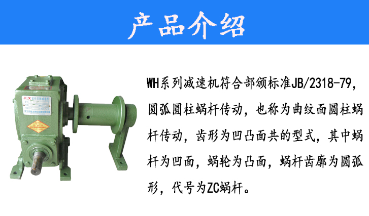 本系列減速機符合部頒標準JB2318-79,圓弧圓柱蝸桿傳動,也稱為曲紋面圓柱蝸桿傳動,齒形為凸凹面共的型式,其中蝸桿為凹面,蝸輪為凸面,蝸桿齒廓為圓弧形,代號為ZC蝸桿。