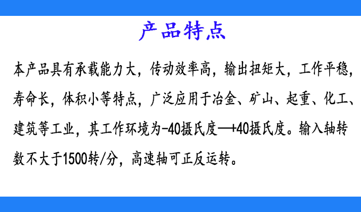 本產品具有承載能力大,傳動效率高,輸出扭矩大,工作平穩,壽命長,體積小等特點,廣泛應用于冶金、礦山、起重、化工建筑等行業,其工作環境為-40℃-+40℃。輸入軸轉數不大于1500轉/分,高速軸可正反運轉。