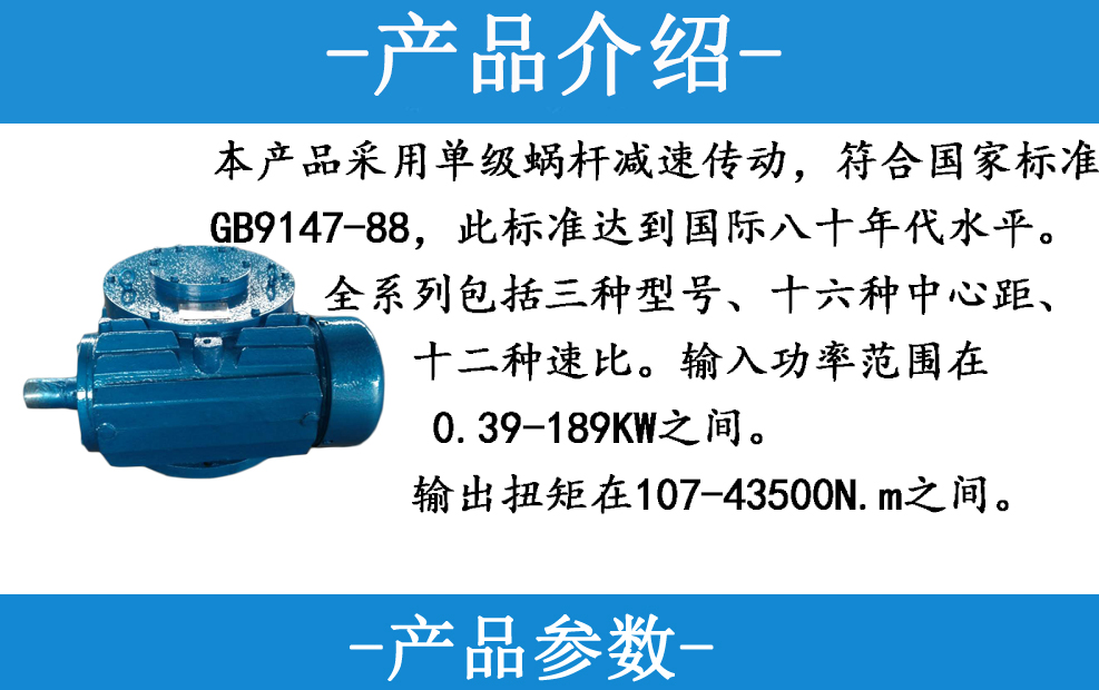 本產(chǎn)品采用單級蝸桿減速傳動,符合國家標準GB9147-88,此標準達到國際八十年代水平。全系列包括三種型號十六種中心距、十二種速比。輸入功率范圍在039-18K之間,輸出扭矩在107-43500Nm之間。