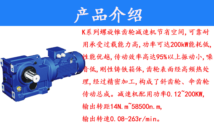 K系列螺旋錐齒輪減速機節省空間,可靠耐用承受過載能力高,功率可達200kW能耗低,性能優越,傳動效率高達95%以上振動小,噪音低,剛性鑄鐵箱體,齒輪表面經高頻熱處理,經過精密加工,構成了斜齒輪、傘齒輪傳動總成。減速機配用功率0.12~200KW,輸出轉距14N.m~58500n.m,輸出轉速0.08-263r/min