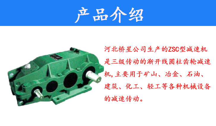 河北橋星公司生產的ZSC型減速機是三級傳動的漸開線圓柱齒輪減速機,主要用于礦山、冶金、石油、建筑、化工、輕工等各種機械設備的減速傳動。