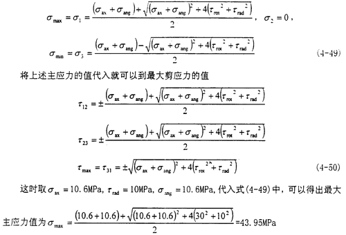 此時的應力情況屬于三向應力狀態,所以其分析過程和徑向不對中90°以及270°以情況相似,只是這里還有了附加的軸向拉應力和附加的角向應力,將各個應力值σxx=σax+σang,σyy=0,σzz=0,τxy=τrot,τyz=0,τzx=τrad分別代入式(4-29)(4-30)(4-31)中,可以得到
