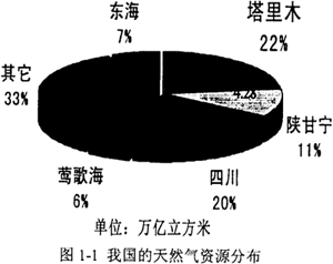 我國天然氣總資源量為3.8×1013m3。其中在面積為560,000km2的塔里木盆地,天然氣資源量就達(dá)8.39×l012m3。其中累計(jì)已探明地質(zhì)儲(chǔ)量4.19×l011m3,剩余可采儲(chǔ)量2.79×l011m3,是國內(nèi)天然氣資源量及剩余可采儲(chǔ)量最豐富的氣區(qū)。預(yù)計(jì)今后五至十年,累計(jì)探明地質(zhì)儲(chǔ)量可達(dá)1×1012m3。此外,從圖1-1可以看到,陜西、四川、青海等地的天然氣儲(chǔ)量也都十分可觀,氣田分布的西傾狀況比較明顯。