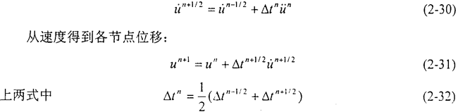 對于每一時(shí)間步長,由運(yùn)動(dòng)方程首先解出各節(jié)點(diǎn)的平動(dòng)加速度,然后根據(jù)顯式中心差分公式解出各節(jié)點(diǎn)速度: