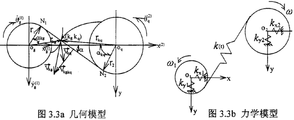 在以往對外齒輪模型簡化時主要采用兩種方法如圖3.3a、3.3b幾何模型和力學模型。在幾何耦合模型中,齒輪輪齒被視為剛體。假定:1.嚙合過程中輪齒始終保持接觸,不脫嚙。2.嚙合線方向保持不變。要滿足假設1,按兩齒輪接觸表面法向速度相等原則: