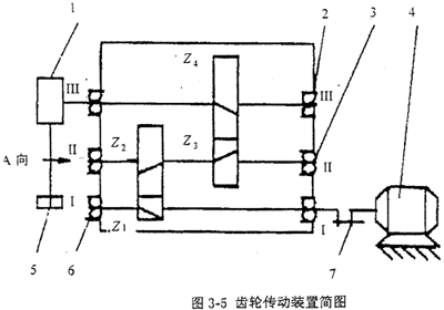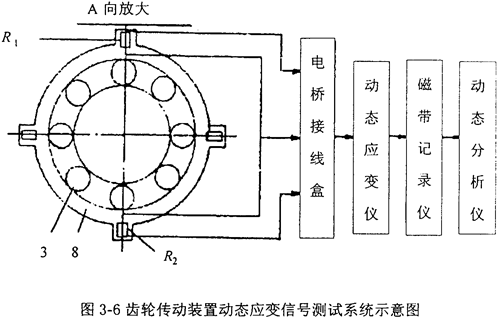 圖3-5是被測試的齒輪傳動裝置傳動系統簡圖,圖3-6是測試該齒輪傳動裝置箱體動態激勵力應變信號的系統示意圖。零件8為裝在軸承外圈上的套圈。套圈把軸系施加給軸承的載荷分成水平方向和垂直方向再傳給箱體。如圖3-6所示,在套圈的水平和垂直方向分別貼上兩片電阻應變片,并分別組成各自的全電橋電路。當軸系產生振動時,軸承對箱體的作用力也隨之發生變化,也使貼在套圈上的應變片的電阻值產生變化,而電阻的變化則通過動態電阻應變儀輸出電壓信號,并經磁帶記錄儀將此電壓信號記錄下來。若將所得的信號在動態數字分析儀上進行時域和頻域分析,再經過比較,就可對齒輪傳動裝置內的軸系部件的故障作出較為正確的診斷。
