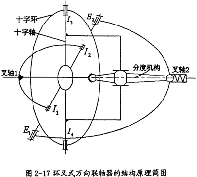 環叉式萬向聯軸器是在雙聯式萬向聯軸器的基礎上發展而成的。取消中間軸,使其兩端的十字軸在幾何上重合為一個平面,從而保證了理論上的等速傳動。為避免兩十字軸重疊時,軸實體發生干涉,將其中一個十字軸實體改為虛體——變形為一個中空的圓環,稱為“十字環”。十字環上開有兩對中心線互相垂直的銷孔和短銷軸,實質上構成虛體十字軸,同樣起十字軸作用,使虛體和實體兩個十字軸在幾何上能重疊為一個平面。由于萬向聯軸器具有“環”和“叉”的結構特征,“環叉式萬向聯軸器”由此得名。