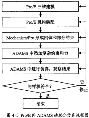 在仿真中如果發現結果不對,則我們需要對前面的模型進行修正,然后再做仿真分析,直到結果正確。總而言之利用Pro/E和ADAMS進行聯合仿真,其基本的步驟如圖4-5所示。