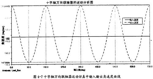 選取合適的步長,在缺省模式下(由前面的自上度為0,可知此時的仿真是運動仿真)對模型做仿真分析,并在結果中輸出兩軸夾角的測量值曲線圖(如圖4-6所示)以及輸入、輸出軸角速度測量的曲線圖(如圖4-7所示)。