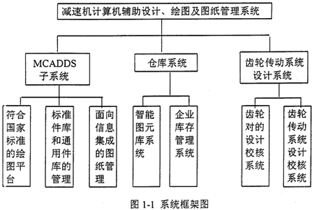 減速機計算機輔助設計、繪圖及圖紙管理系統主要包括MCADDS子系統和齒輪傳動系統的設計系統和信息管理系統三部分(見圖1-1),其中MCADDS子系統實現高效繪圖;齒輪傳動系統的設計系統快速精確的實現產品設計;而信息管理系統將提高企業的信息管理與控制,提高資源利用率。