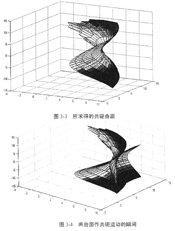 求出共軛曲面各節點坐標值后,調用MATLAB繪圖命令就可以顯示共軛曲面的圖形,并通過編制的程序,還能夠以動畫的形式演示兩曲面作共軛運動的過程。求得的共軛曲面及兩曲面作共軛運動的瞬間分別如圖3-3、圖3-4所示: