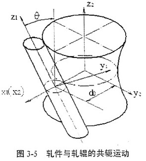 如圖3-5,軋輥軸線z2豎直放置,軋件軸線為z1,兩者交錯成θ角度,垂直距離為d0,軋件半徑為r0。在軋制過程中軋輥是轉動的,現在假設軋輥不轉,根據相對運動原理,則軋件就以軋輥軸線為軸作旋轉運動,若軋件同時繞自身軸線回轉,則軋件的相對運動包括自轉和公轉。以軋件為已知曲面Σ1,它與坐標系S1固連,轉動角速度為ω1,Σ1上的各點在S1中的用規則矩陣表示為X1(1),Y1(1),Z1(1);以軋輥為所求的共軛曲面Σ2,它與坐標系S2固連,轉動角速度為ω2,則軋件的運動可以用矩陣變換的形式表示為:
