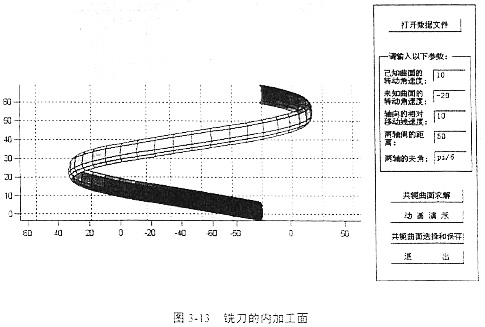 借助于軟件Conjugater1.0求銑刀加工的過程與求解軋輥曲面的過程相同。輸入輸出界面和結果如圖3-10、圖3-11、圖3-12、圖3-13所示。最后得到如圖的兩個螺旋面,這兩個螺旋面都是滿足共軛條件的,圖3-12表示銑刀在工件實體的外圓加工所得的曲面,圖3-13表示銑刀在工件的內壁加工所得的曲面。應用時可根據實際情況選取。