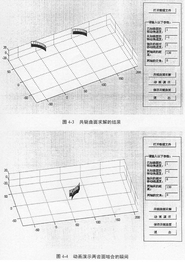 應用共軛曲面求解軟件Conjugater1.0求得的齒輪齒面嚙合過程和結果可以用圖4-2、圖4-3和圖4-4表示。
