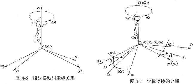 把以上的相對擺動具體化,考慮兩坐標系的變換,在靜坐標系S2中觀察,整個S1坐標系只有2個自由度,即S1分別繞z1軸的自轉和繞z2軸的公轉。在交角不變的情況下兩坐標系的關系可用圖4-6表示。