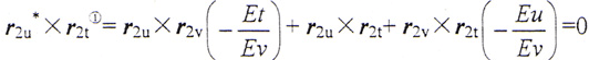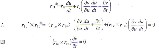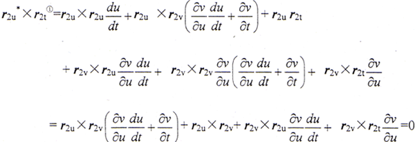 為了使上述向量方程變為標量方程,使等式兩端點積以r2u×r2v(≠0),并按拉格朗日恒等式展開,整理后得
