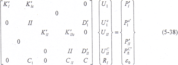若用三角分解算法進行分解消元運算,使與接觸面有關的剛度矩陣變換成為單位矩陣,同時求出相應的系數矩陣的改變DⅠ、DⅡ和載荷向量的改變PⅠ′、PⅠC、PⅡ′、PⅡC,則矩陣方程成為