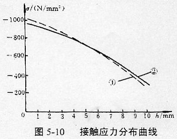 基于上述接觸問題的有限元與邊界元計算模型和前面的載荷分析,對一模數m=5mm、齒數Z=40、分度圓壓力角a=20°、分度圓直徑d=200mm、齒寬b=20mm、齒輪材料的彈性常數E=2.1×105N/mm2、泊松比μ=0.3、傳遞扭矩Mn=300N·m的共軛鼓形齒聯軸器鼓形齒輪Ⅰ進行了接觸應力計算,其簡圖如圖5-9所示。該問題接觸應力的有限元與邊界元數值解和接觸應力分布曲線分別如表5-1、圖5-10所示。曲線①(虛線)為接觸應力的有限元解;曲線②(實線)為接觸應力的邊界元解。