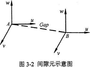 在I-DEAS中,間隙元是為防止兩接觸面產生相互嚙入干涉而定義的,如圖3-2所示,A、B分別為具有初始間隙的分離接觸面上的兩節點,把這兩節點用間隙元Gap連結起來。在I-DEAS中,間隙元主要有三個屬性,即初始間隙δ0、方位碼u、同軸標志Flag,并且,這三個值是相互關聯的。初始間隙并非模型圖中兩節點之間的距離,而是由用戶給定的一個精確值,以避免建模誤差。方位碼指定間隙元的方向,具有從-6到+6之間除O之外的的12個值,分別代表6個自由度的正負方向,即沿x、y、z軸的移動和轉動方向。同軸標志取0或1,當Flag=0時,方位碼有效,間隙元沿某一指定坐標方向;Flag=1時,方位碼無效,間隙元沿兩節點連線方向。在圖3-2中,設指定方位碼為沿u向,Flag=0,則當uA-uB≤δ0時,認為間隙元沒有閉合,接觸面間不會產生應力應變。而一旦uA-uB>δ0,則認為間隙元已閉合,間隙元在指定方向將具有很大的剛度(缺省時系統一般取接觸面材料的三階),此時兩節點無法沿指定方向相互嵌入,而只能沿指定方向切向運動。如指定接觸面摩擦系數,閉合后的間隙元還將具有一定的橫向剛度,即沿切向摩擦阻尼產生的等效剛度。