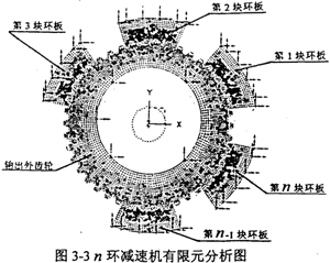 對于如圖3-3所示的具有n個內齒環板的減速機有限元分析模型,本章運用I-DEAS分析軟件,采用間隙單元法,在與工況一致的載荷和邊界條件下,分別求出各個環板上的主應力的最大值和平均值,運用公式(3-7)就可得到n環少齒差減速機的載荷分配不均勻系數KP。