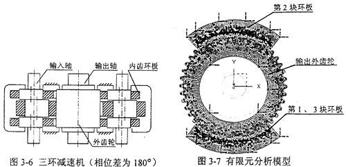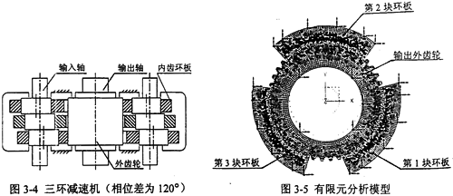 眾所周知,在行星傳動中,載荷分配不均勻系數KP越小,則該種傳動的載荷分配性能越佳。否則載荷分配不均勻系數KP越大,則該種傳動的載荷分配性能越差。本章提出了一種利用有限元方法一間隙單元法計算三環減速機載荷分配不均勻系數KP的方法,通過對兩種三環減速機實例計算載荷分配不均勻系數可以得到,第二種三環減速機(環板之間相位差為180°)不僅實現了慣性力和慣性力偶矩的動平衡,而且在同樣的制造安裝誤差下,它的載荷分配不均勻系數比第一種三環減速機(環板之間相位差為120°)小。也就是說:在載荷分配上,它優越于第一種三環減速機。