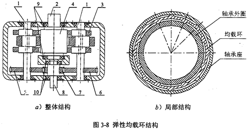 對于三環減速機來說,因三片內齒環板受力大,質量大,環板中心移動量小,可以利用本文提出金屬彈性環作為均載機構,彈性均載環加裝在輸出軸和一級輸入軸上的軸承外圈和軸承座孔之間,彈性均載環結構如圖3-8所示。a)為整體結構,b)為局部結構。輸出軸均載環9加裝在三環減速機的輸出軸2的軸承外圈和軸承座孔之間,輸入軸均載環10加裝在三環減速機的一級輸入軸8的軸承外圈和軸承座孔之間,彈性環的變形使輸出軸和一級輸入軸上的外齒輪浮動,補償制造安裝誤差和傳動變形,從而可以實現三環減速機的均載和減振。