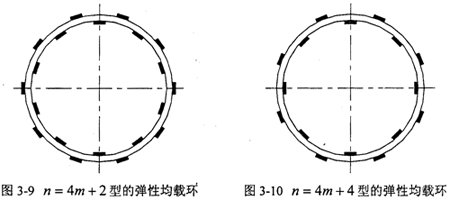 根據彈性均載環的外凸臺數或內凸臺數可將這種低剛性彈性支承分為兩類,一類凸臺數為n=4m+4,另一類凸臺數為n=4m+2,m可為任意自然數。對于圖3-9,m=2;對于圖3-10,m=l。