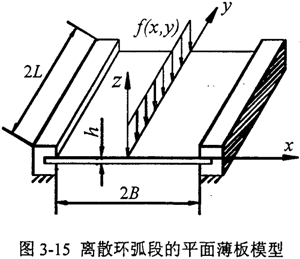 彈性力學是固體力學的一個分枝,主要研究物體(彈性體)由于受外力作用或溫度改變以及支座沉陷等原因而產生的應力、形變和位移,彈性力學對彈性體作較精確的分析。對于本文的離散均載環弧段,環弧段的厚度h<<它的長度2L(或寬度2B),且撓度較小,可以利用彈性力學中薄板的小撓度變曲理論,將均載環結構參數與剛度聯系起來,通過正確處理邊界條件來改善計算結果。離散環弧段的計算模型如圖3-15所示,假定環弧段的支承邊界條件為兩端固支。